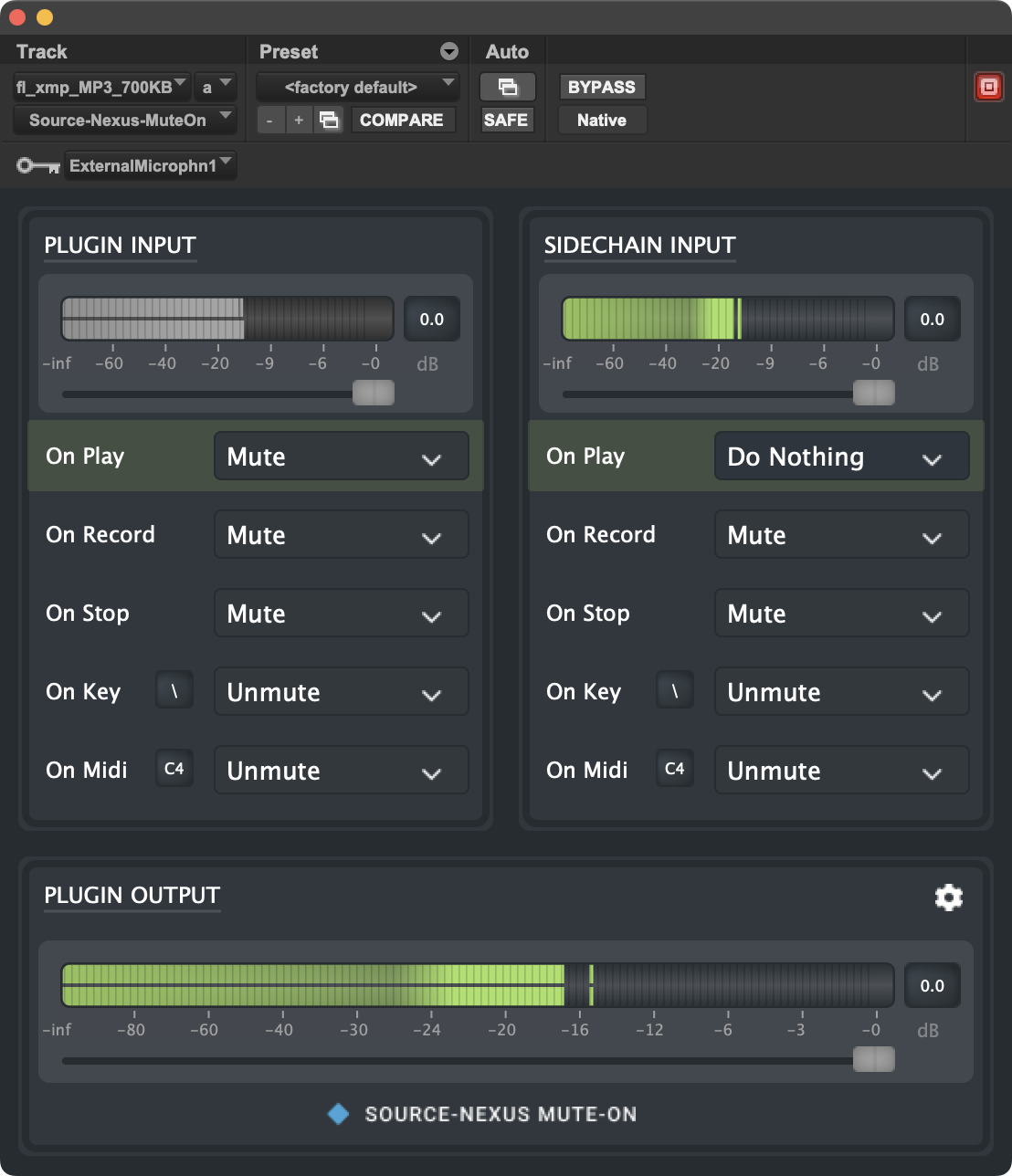 Source-Nexus Mute-On builds on the features in Source-Talkback to offer mute and dim options when your playback is idle, when music is playing, or when you are recording. On top of that, you can also take the normal plugin input audio as well as the sidechain/key input audio, and mix them both together into the plugin’s output. This opens up many new possibilities for talkback and monitoring that would require multiple tracks previously.